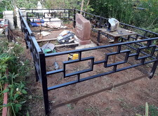 Затем мы приступили к монтажу заранее привезённой на кладбище простой металлической оградки. Параллельно с установкой ограждения мы окончательно очистили участок, а также сварили металлический каркас по периметру могилы. Он не только придаст дополнительную жёсткость ограждению, но и послужит бортами для будущего покрытия.