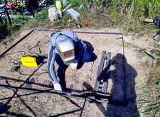 Далее мы дополнительно вварили металлические уголки, придающие получившемуся каркасу необходимую жёсткость и вкрутили две сваи, на которые строго по