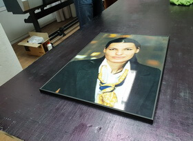 В ходе выполнения данного заказа нам предстояло в срочном порядке изготовить цветную фотографию усопшего в металлической рамке. Такого рода работы практически всегда срочные, так как потрет заказывается для непосредственной установки в день похорон. Начинается выполнение заказа с распечатки фотографии, стандартные размеры которой 50х70 сантиметров.
