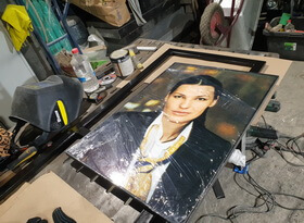 Остался последний этап – доставить портрет в рамке заказчику. Перед транспортировкой мы заматываем его упаковочной плёнкой в несколько слоёв, чтобы предотвратить любые механические повреждения. Данный заказ был выполнен нами за сутки, хотя в целом подобного рода работы занимают полтора-два дня. Как видите, если заказывать портрет у нас сразу же после смерти человека – более чем реально установить его на могилу непосредственно в день похорон.