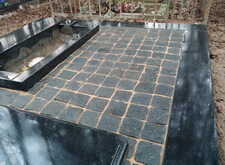 Первым делом на месте захоронения был проведен демонтаж всего, что там было. Сооружен бетонный ленточный фундамент. Уложена гранитная подложка под ограду, подставка под памятник, цветник и лавочка, также все свободное пространство могилы закрыто гранитной брусчаткой. Кстати, изначально лавочка была установлена иначе, чем обсуждалось и ее пришлось переустановить, хотя на могиле именно первый вариант установки был более привлекателен.