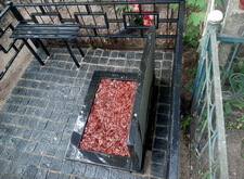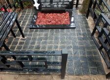 Далее мы начали выложили гранитную брусчатку, предварительно установив лавочку и приварив к основанию нового ограждение металлический каркас. Сами плитки засыпали пескобетонной смесью.
