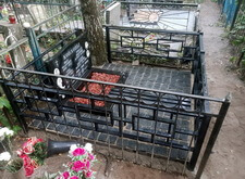 Затем мы заменили ограждение на заранее изготовленную из прямоугольного профиля металлическую оградку. Параллельно мы установили у подножья широкого памятника прямоугольный цветник, собранный из гранитных балок, а также застелили территорию участка геотекстилем, препятствующим прорастанию сорной травы сквозь швы в наземном покрытии.
